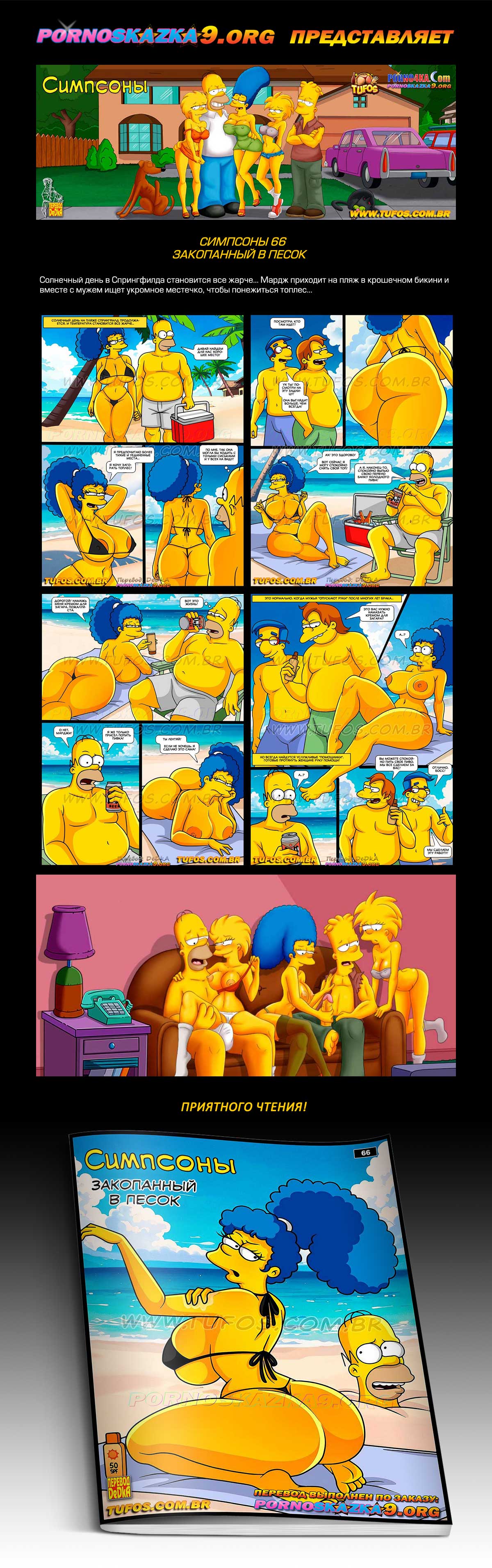 Порно комикс «Симпсоны. Часть 66. Закопанный в песок.» В Спрингфилде жаркий солнечный день и местные жители отправляются отдыхать на пляж… Нильсон и Милхаус сразу идут купаться, а Барт предпочитает остаться на берегу и любоваться красотками в бикини…